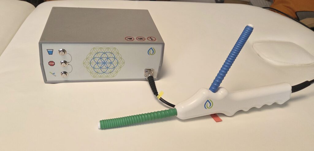 Der Multiwellen-Oszillator, ursprünglich von George Lakhovsky erfunden, ist eine Weiterentwicklung der Vorlage aus dem frühen 19. Jh. Er sendet als Standard elektromagnetische Wellen in den Solfeggio-Frequenzen (Tonleiter C,D,E,F,G,A,H auf der Basis von 432 Hz als Kammerton A) aus. Dies bewirkt eine Stimulation auf Organebene, wodurch die Leistung aller befeldeten Organe verbessert wird und eventuelle Schäden behandelt werden können. Das von mir verwendete Modell bietet auch die Möglichkeit der Einspeisung von beliebigen Frequenzen im Niederfrequenzbereich (0Hz – 100kHz). Ich setze ihn oft ein um mit den entsprechenden Frequenzen Hirnwellen sowohl akustisch wie auch elektromagnetisch zu stimulieren. Meditationen gehen tiefer und leichter, psychischer Stress nimmt ab und auch Unregelmäßigkeiten in der Hirnfunktion, wie ADHS, Konzentrationsstörungen und anderes können dadurch reguliert werden.